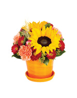 Prix unitaire / parDeux majestueux tournesols attirent toute l'attention dans cette magnifique composition... cependant, le ravissant aster, les œillets orange et l'eucalyptus méritent également d'être salués pour avoir complété un design captivant présenté dans un pot orange.