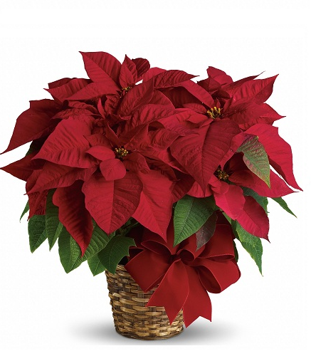 Send this gorgeous, explosion of popular red poinsettia plants for Christmas. Long-lasting, hardy and festive. Deluxe assortment of red poinsettia plants accented with Christmas decorations and greens is arranged in 8" bamboo basket.